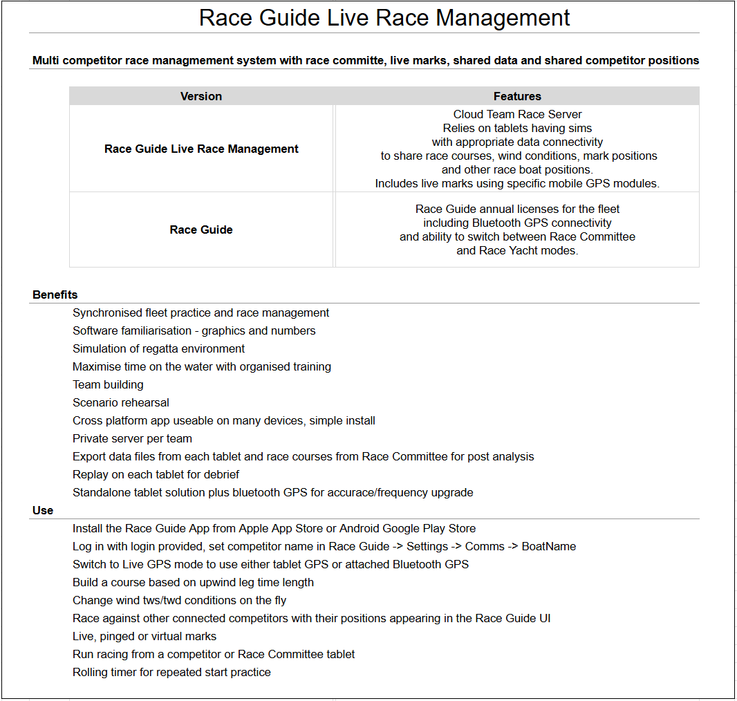 Race Guide Live Race Management is a competitor race managmement system with race committe, live marks, shared data and shared competitor positions.